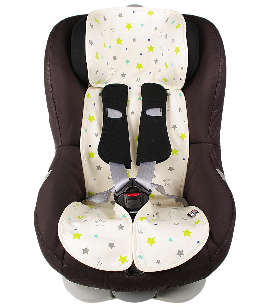 Univerzální vložka do dětské autosedačky velikosti 9 až 36 kg i 9 až 18 kg. Povrch je ze 100% bio-bavlny s motivem hvězdiček, spodní strana je z 3D polyesteru, který zajistí proudění vzduchu. Praní na 30 °C. Vyrobené v České republice.