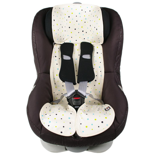 Univerzální vložka do dětské autosedačky velikosti 9 až 36 kg i 9 až 18 kg. Povrch je ze 100% bio-bavlny s motivem puntíků, spodní strana je z 3D polyesteru, který zajistí proudění vzduchu. Praní na 30 °C. Vyrobené v České republice.