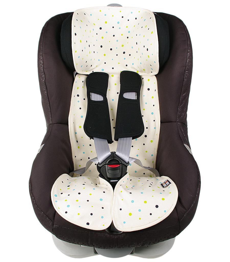 Univerzální vložka do dětské autosedačky velikosti 9 až 36 kg i 9 až 18 kg. Povrch je ze 100% bio-bavlny s motivem puntíků, spodní strana je z 3D polyesteru, který zajistí proudění vzduchu. Praní na 30 °C. Vyrobené v České republice.