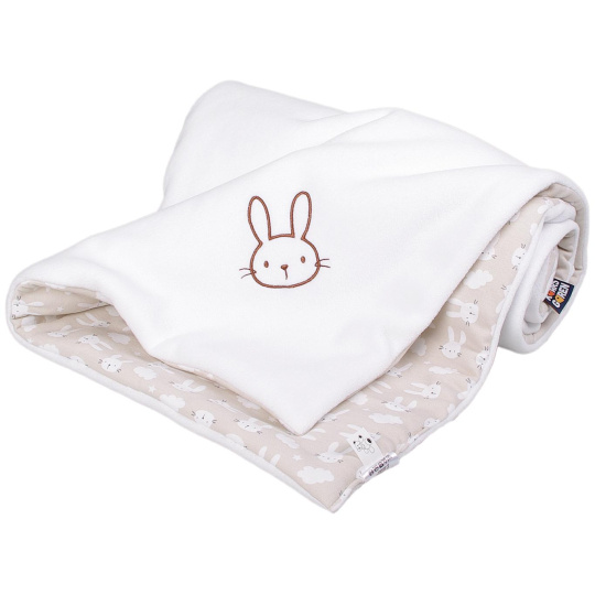 Zateplená dětská deka v provedení fleece, vatelín, bavlna. Barevnost bílá a béžová s motivem zajíčků. Rozměr 70 x 100 cm. Praní na 30° C. Česká výroba.