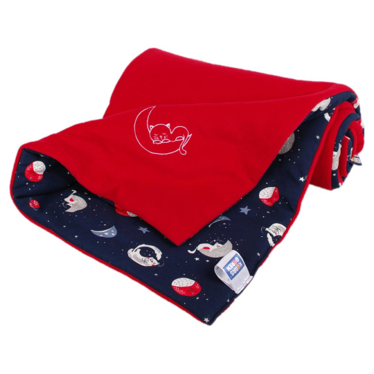 Zateplená dětská deka v provedení fleece, vatelín, bavlna. Barevnost červená, motiv kočičky. Rozměr 70 x 100 cm. Praní na 30° C. Česká výroba.