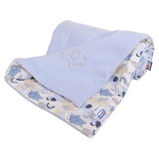 Zateplená dětská deka v provedení fleece, vatelín, bavlna. Barva modrá, motiv slonů. Rozměr 70 x 100 cm. Praní na 30 °C. Česká výroba. Deka je vhodná do kočárku, do autosedačky i na doma, lze použít i jako dětskou peřinku.