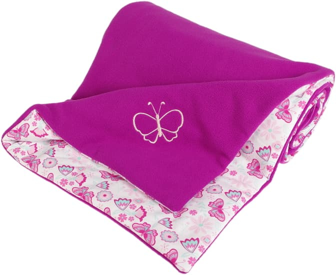 Zateplená dětská deka v provedení fleece, vatelín, bavlna. Barva ostružinová, motiv motýlci. Rozměr 70 x 100 cm. Praní na 30 °C. Česká výroba. Deka je vhodná do kočárku, do autosedačky i na doma, lze použít i jako dětskou peřinku.