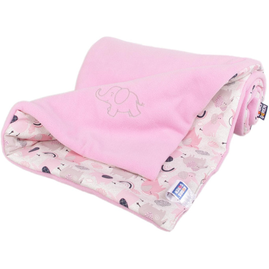 Zateplená dětská deka v provedení fleece, vatelín, bavlna. Barva růžová, motiv slonů. Rozměr 70 x 100 cm. Praní na 30 °C. Česká výroba. Deka je vhodná do kočárku, do autosedačky i na doma, lze použít i jako dětskou peřinku.