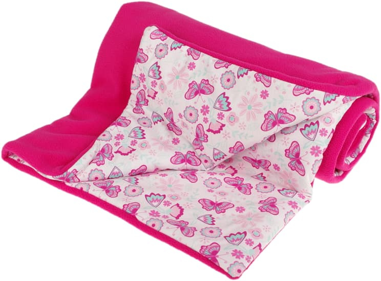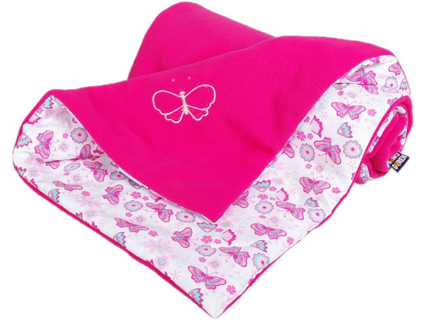 Zateplená dětská deka v provedení fleece, vatelín, bavlna. Barevnost růžová, motiv motýlci. Rozměr 70 x 100 cm. Praní na 30 °C. Česká výroba. Deka je vhodná do kočárku, do autosedačky i na doma.