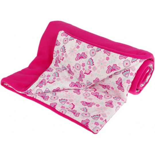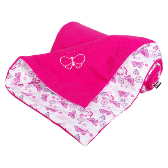 Zateplená dětská deka v provedení fleece, vatelín, bavlna. Barevnost růžová, motiv motýlci. Rozměr 70 x 100 cm. Praní na 30 °C. Česká výroba. Deka je vhodná do kočárku, do autosedačky i na doma.