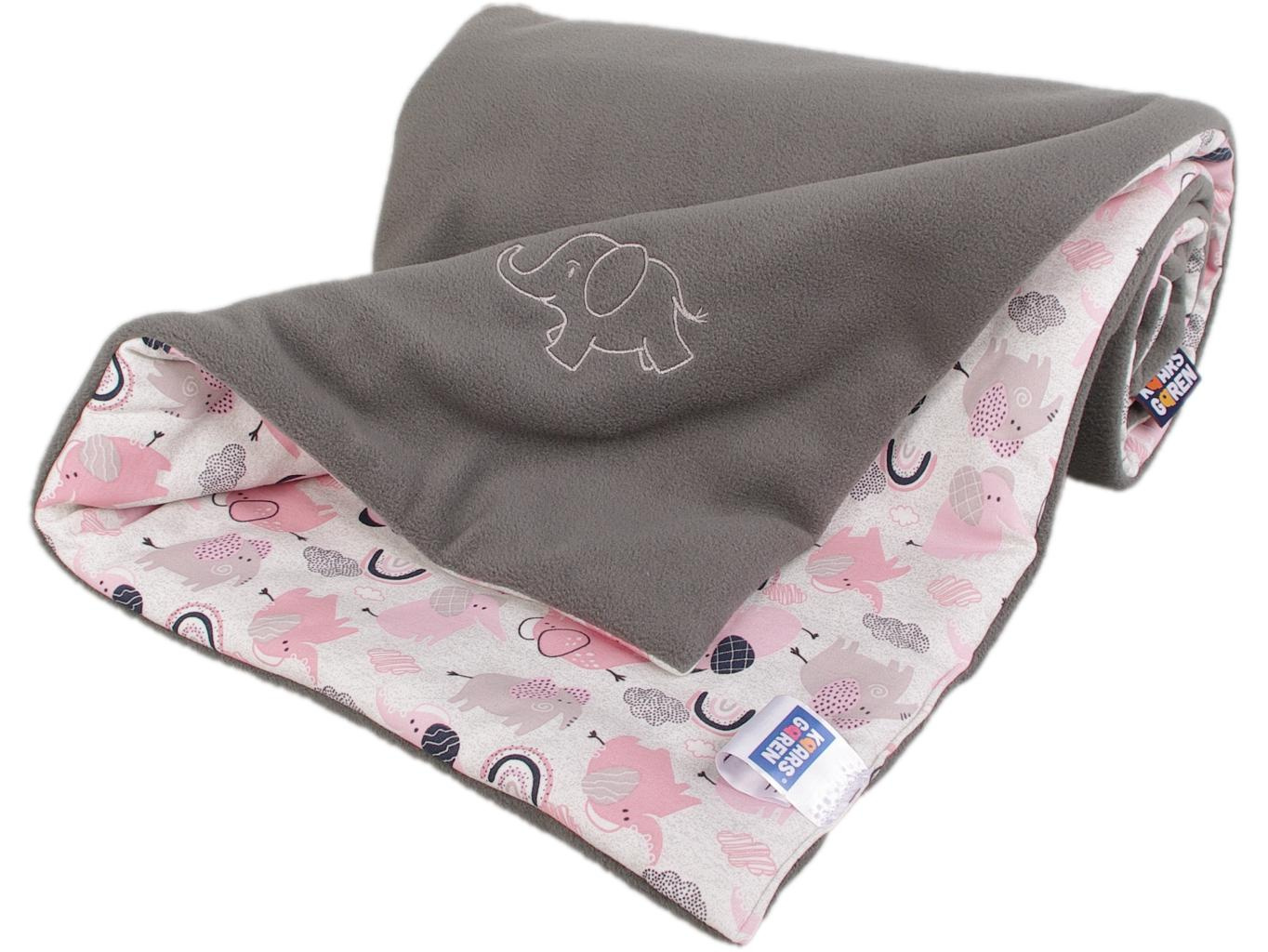 Zateplená dětská deka v provedení fleece, vatelín, bavlna. Barva šedá, motiv růžoví sloni. Rozměr 70 x 100 cm. Praní na 30 °C. Česká výroba. Deka je vhodná do kočárku, do autosedačky i na doma, lze použít i jako dětskou peřinku.