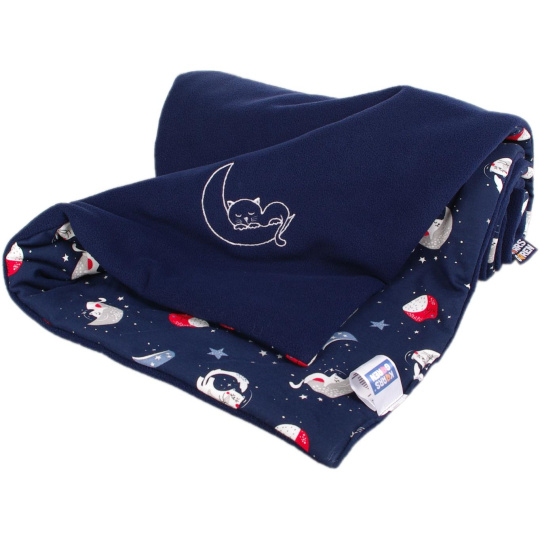 Zateplená dětská deka v provedení fleece, vatelín, bavlna. Barevnost tmavomodrá, motiv kočičky. Rozměr 70 x 100 cm. Praní na 30° C. Česká výroba.