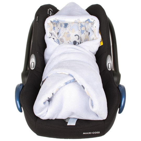 Zateplená zavinovačka v provedení wellsoft - vatelín - bavlna. Podšívka je z bavlny s motivem modrých sloníků, vnější strana z wellsoftu a výplň z vatelínu. Rozměr je cca 75 x 75 cm, praní na 30 °C. Zavinovačku je možné používat i do autosedačky s tříbodovým zapínáním. Česká výroba.