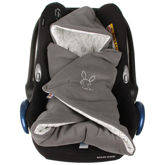 Zateplená zavinovačka v provedení fleece - vatelín - bavlna. Podšívka je z bavlny s motivem zajíčků, vnější strana z fleecu a výplň z vatelínu. Rozměr je cca 75 x 75 cm, praní na 30 °C. Zavinovačku je možné používat i do autosedačky s tříbodovým zapínáním. Česká výroba.