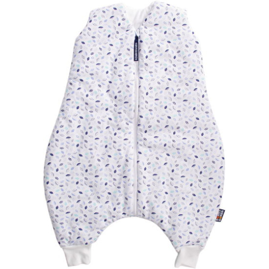 Spací pytel pro miminko s otvory pro nohy v bílé barvě a s motivem modrých lístečků. Délka spacího pytle je cca 70 cm, lze jej prát v pračce při 30 °C. Spací pytel má uprostřed zip a lze jej zcela otevřít, navíc má zip látkovou krytku, která zabraňuje přiskřípnutí krku do zipu. Spací pytel je ušitý ze tří vrstev: vrchní materiál 100% bavlna, výplň 100% polyester, podšívka 100% bavlna. TOG 2.61 / 16 až 20 °C. Česká výroba.