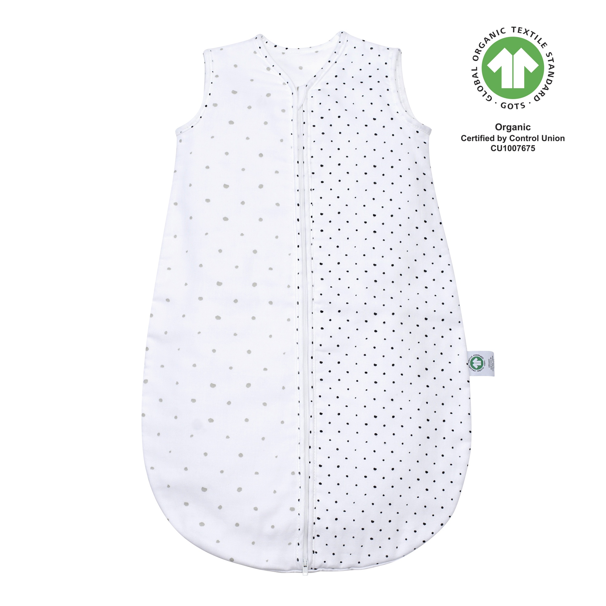 MOTHERHOOD Pytel na spaní mušelínový BIO Grey and Black Dots 6-18 m 0,5 tog