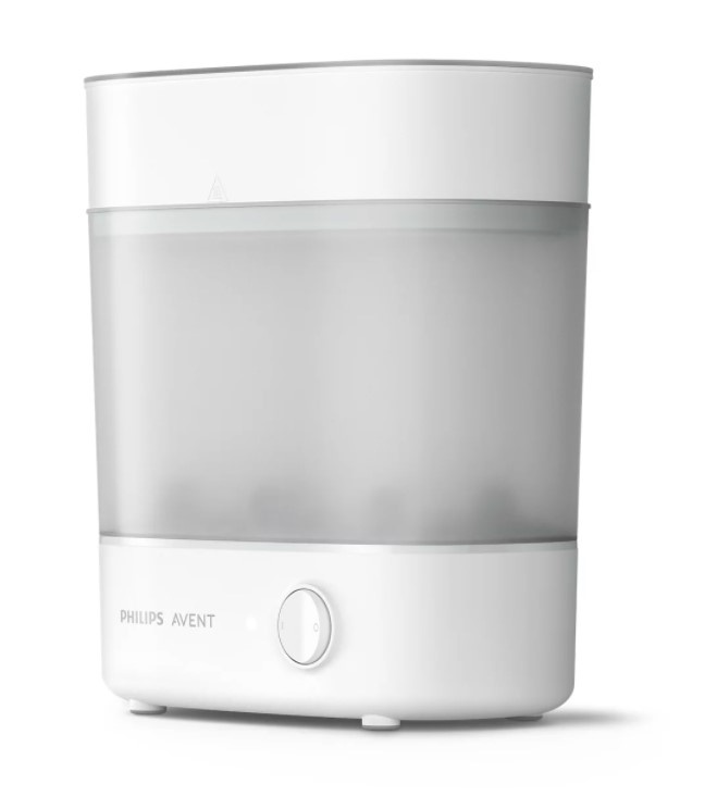 Sterilizace a uložení. Úzký, ale prostorný sterilizátor lahví je rychlý a účinný, zabíjí 99,9 % bakterií. Vlastnosti: - Nastavitelná velikost umožňuje dokonalé přizpůsobení předmětům, které potřebujete sterilizovat. - Mimořádně rychlý a bezpečný. - Vysterilizuje až 6 lahví AVENT za pouhých 10 minut a automaticky se vypne. - Intenzivní teplo z horké párky zničí během chvíle škodlivé bakterie. - Lze sterilizovat odsávačku mateřského mléka včetně příslušenství. - Nádobka na odkapávání chrání výhřevnou desku a snižuje tak riziko nepříjemného zápachu. - Pokud víko není otevřeno, obsah zůstane sterilní po dobu 24 hodin Nebezpečí - Nikdy neponořujte základnu, síťový kabel ani elektrickou zástrčku do vody ani jiné kapaliny. - Neuposlechnutí těchto pokynů pro odstranění vodního kamene může způsobit nenapravitelné škody. - Základnu nikdy nedemontujte, aby nedošlo k úrazu elektrickým proudem. Varování - Přístroj mohou používat osoby se sníženými fyzickými, smyslovými nebo duševními schopnostmi nebo nedostatkem zkušeností a znalostí, pokud jsou pod dohledem nebo byly poučeny o bezpečném používání přístroje a rozumí všem rizikům spojeným s používáním přístroje. - Přístroj nesmějí používat děti. Přístroj a napájecí kabel udržujte mimo dosah dětí. - Děti si s přístrojem nesmí hrát. - Dříve než přístroj připojíte do sítě, zkontrolujte, zda napětí uvedené na přístroji souhlasí s napětím v místní elektrické síti. - Pokud byste zjistili závadu na zástrčce, na napájecím kabelu nebo na přístroji, dále jej nepoužívejte. - Pokud by byl poškozen napájecí kabel, musí jeho výměnu provést společnost Philips, autorizovaný servis společnosti Philips nebo obdobně kvalifikovaní pracovníci, aby se předešlo možnému nebezpečí. - Uvnitř přístroje nejsou žádné součásti vyžadující údržbu. Přístroj se nepokoušejte otevírat ani jej sami opravit. - Přístroj se během provozu zahřeje na vysokou teplotu a při dotyku může způsobit popáleniny. - Dávejte pozor na horkou páru unikající z otvoru ve víku a také na páru unikající při sundávání víka. Mohli byste se opařit. - Nedotýkejte se základny, košů ani víka během provozu ani krátce poté, protože tyto součásti jsou velice horké. Víko zvedejte pouze za rukojeť. - S přístrojem nikdy nepohybujte ani jej neotevírejte během používání nebo pokud je voda v něm stále horká. - Během používání na přístroj nikdy neodkládejte žádné předměty. - Používejte pouze vodu bez přídavku dalších prostředků. - V přístroji nepoužívejte bělidlo ani jiné chemikálie. - Nenalévejte vodu nad značku na nádržce ani jí nenalévejte více než 130 ml. - Sterilizujte pouze kojenecké lahve a jiné předměty, které jsou do těchto přístrojů vhodné. Ověřte si v uživatelské příručce k předmětům, které se chystáte sterilizovat, že jsou do přístroje vhodné. - Chcete-li provoz ukončit, vypněte přístroj stisknutím vypínače. - Přístroj je určen výhradně pro použití v domácnosti. - Přístroj používejte pouze k účelu, ke kterému je určen. Předejdete tak možnému zranění. Upozornění - Nikdy nepoužívejte příslušenství nebo díly od jiných výrobců nebo takové, které nebyly doporučeny společností Philips. Použijete-li takové příslušenství nebo díly, pozbývá záruka platnosti. - Nevystavujte přístroj extrémnímu horku ani přímému slunečnímu světlu. - Před manipulací nebo uložením nechte přístroj vždy vychladnout. - Přístupné povrchy mohou být během používání přístroje horké. - Nesterilizujte velmi malé předměty, které mohou propadnout skrze otvory na dně koše. - Pokud je přístroj zapnutý, nikdy nepokládejte předměty přímo na topné těleso. - Přístroj nepoužívejte, pokud spadl na zem nebo je jakýmkoli způsobem poškozený. Nechte ho opravit v autorizovaném servisním centru Philips. - Přístroj vždy pokládejte a používejte na suchém, stabilním, vyrovnaném a vodorovném povrchu. - Přístroj nepokládejte na horkou podložku. - Nenechávejte napájecí kabel viset přes hranu stolu nebo pracovní desky, na které je přístroj postaven. - Vždy vyčkejte, až přístroj po použití vychladne, a poté zbývající vodu vylijte. - Před výměnou příslušenství, nebo než se přiblížíte k dílům, které se během provozu pohybují, vypněte přístroj a odpojte napájení. - Podmínky prostředí, jako je teplota a nadmořská výška, mohou ovlivnit funkci tohoto přístroje. - Čištění a uživatelskou údržbu nesmějí provádět děti. - Vždy odpojte zařízení od napájení, pokud je ponecháno bez dozoru. Adresa dodavatele: Philips Consumer Lifestyle B.V., Tussendiepen 4, 9206 AD Drachten, The Netherlands, PH.CentralRegulatoryOfficer@philips.com