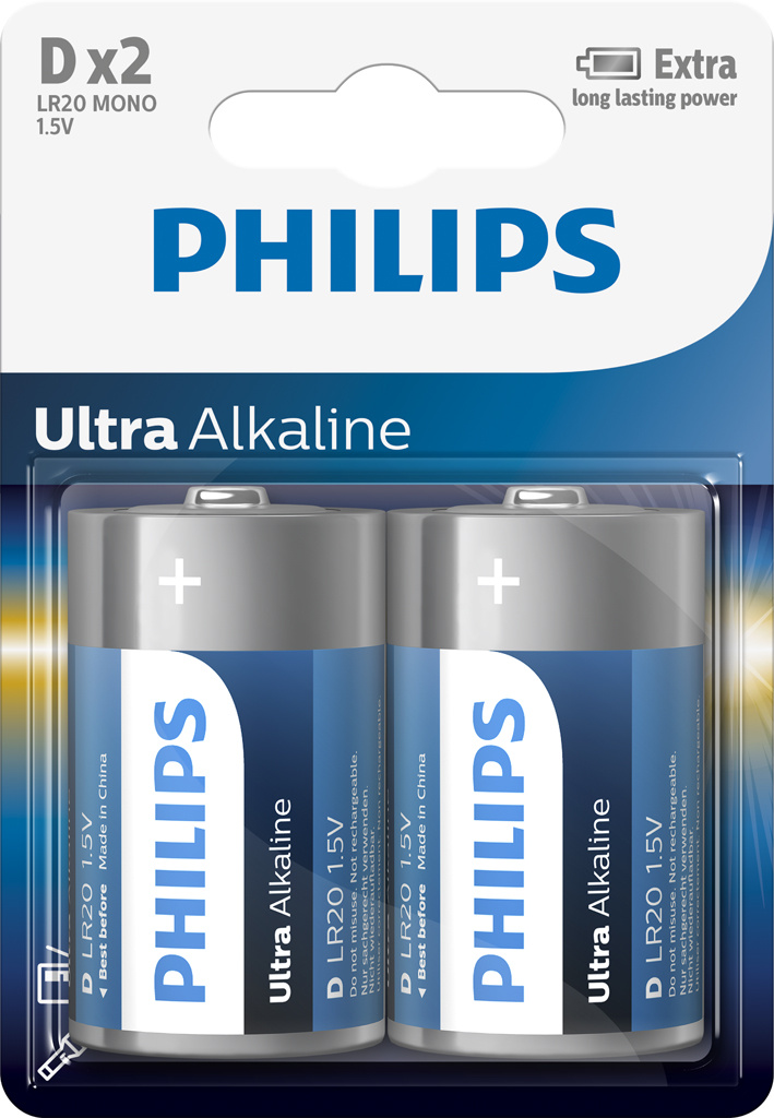 D (1,5V), řada Ultra Alkaline, poskytují o 30% více energie než obyčejné alkalické baterie. Alkalické baterie jsou 6x lepší než průměrné zinkouhlíkové baterie. Tyto baterie Philips zaručeně neobsahují žádné škodlivé těžké kovy, jako je kadmium, rtuť a olovo.
