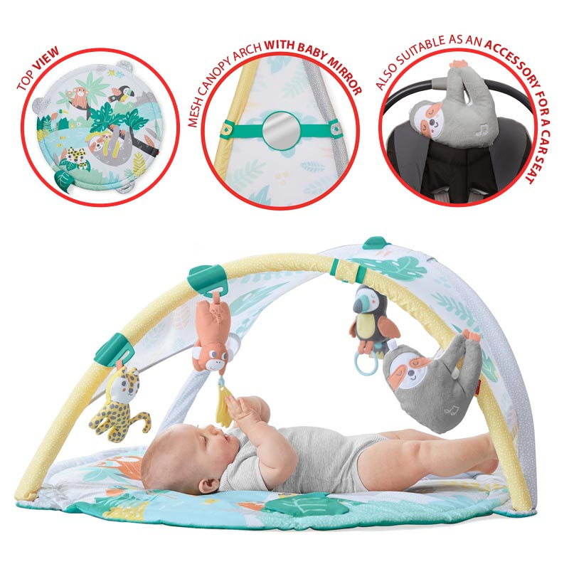 Unikátní deka na hraní s motivem Tropical Paradise vytvoří kouzelné místo na hraní pro Vaše děťátko. Tropičtí kamarádi vtáhnou děťátko do tajuplné džungle, kde může objevovat a zkoumat ještě neprobádané. Deka nabízí 3 způsoby hry, a to během ležení na zádech, času stráveného na bříšku a i během sezení. Deka obsahuje mnoho aktivit pro miminko, které rozproudí zábavu. Tropický kamarád lenochod, kterého můžete připnout i na většinu autosedaček, zpříjemní cestu Vašemu děťátku, ať si ho vezmete kdekoliv. Děťátko budou uklidňovat 2 druhy zvuků: "déšť a zvuk potoka" a "bílý šum a tlukot srdce", které hrají po dobu 10 minut. Závěsné hračky plné aktivit můžete přemisťovat na hrazdičce podle potřeby. - Deka obsahuje 4 hračky a měkký polštářek ve tvaru listu - Všechny hračky jsou odnímatelné - Hračky podporují rozvoj motorických dovedností děťátka - Deka neobsahuje standardní hrazdičku, ale je specifická dvěma oblouky propojenými jemnou síťovinou s potiskem tropického lesa, která děťátko zabaví a zároveň rozvíjí a stimuluje jeho smysly. - V stříšce se nachází bezpečnostní zrcátko, ve kterém děťátko poznává samo sebe - Klipy na hračky se lehce posouvají po obloucích, díky čemuž deku snadno a jednoduše přizpůsobíte potřebám Vašeho miminka. - Hračku lenochoda lze připnout na autosedačku, postýlku, lehátko nebo jen tak vložit do postýlky. Lenochod děťátko uklidní 2 druhy uklidňujících zvuků 1. Zvukem deště a potoka 2. Bílým šumem a tlukotem srdce Zvuky se automaticky po 10 minutách vypnou - deka vyžaduje 3 AAA baterie, které nejsou součástí balení - vhodné pro děti od narození Rozměry produktu: 59,7 cm x 47,6 cm x 9,5 cm