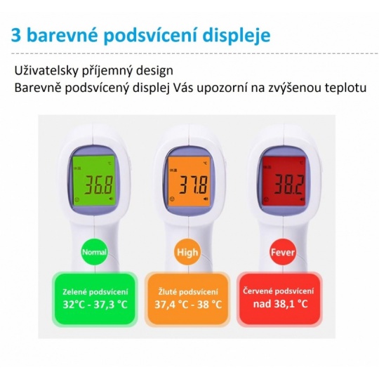 · Vizuální alarm horečky (3 barevně podsvícený displej v režimu tělesné teploty: zelená do 37,3 °C, žlutá 37,4 °C - 38 °C, červená od 38,1 °C)
