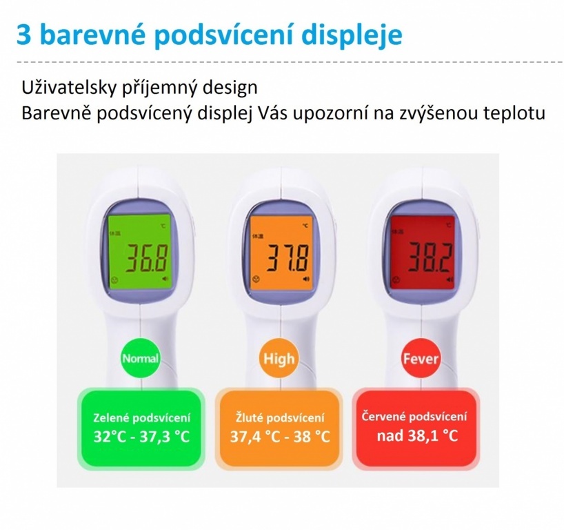 · Vizuální alarm horečky (3 barevně podsvícený displej v režimu tělesné teploty: zelená do 37,3 °C, žlutá 37,4 °C - 38 °C, červená od 38,1 °C)